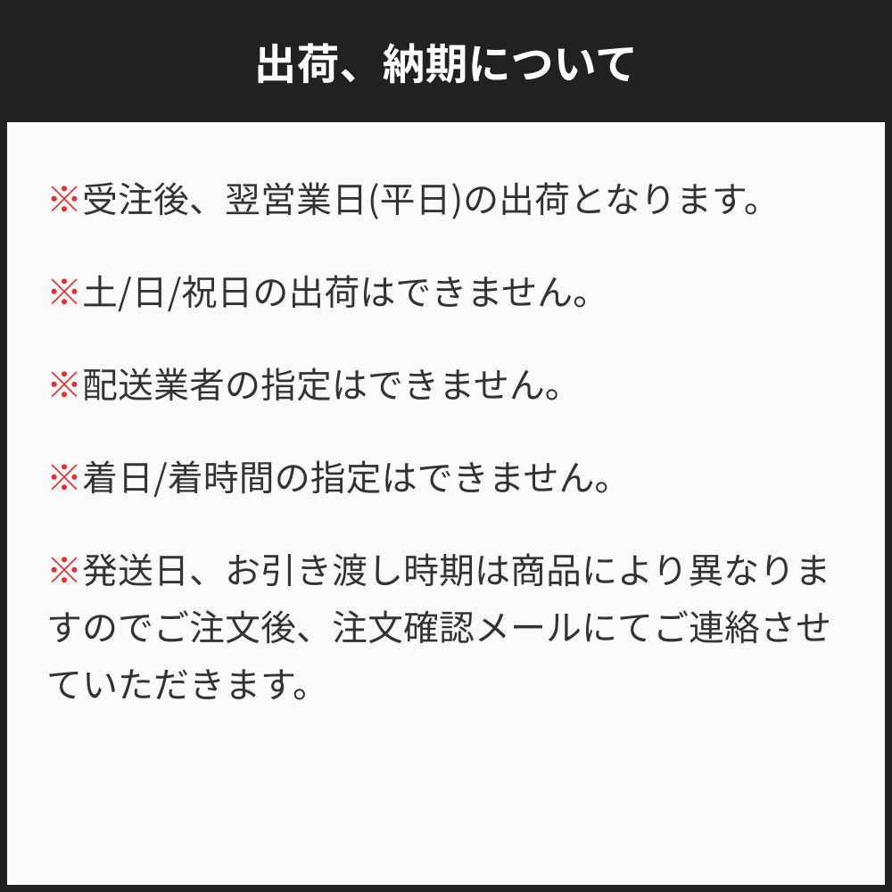 ※商品の発送はできる限り迅速に行っておりますが、記載されております納期よりも遅れる場合がございますので、予めご了承のほどお願い申し上げます。※配送業者をご指定いただくことはできません。